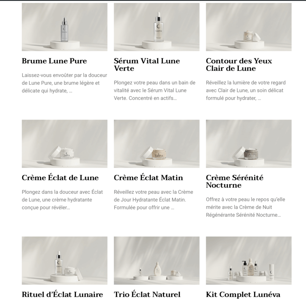 J’ai ensuite conçu la page d’accueil du site, puis une page présentant l’ensemble des produits, chacun personnalisé avec le logo et le nom du produit. Chaque article dispose d’une fiche détaillée comprenant les indications d’utilisation, les précautions, et la liste des ingrédients.