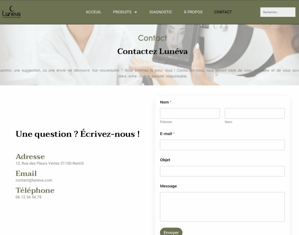 J’ai également développé un formulaire de diagnostic de peau, permettant aux clients potentiels d’obtenir des recommandations personnalisées selon leur type de peau.