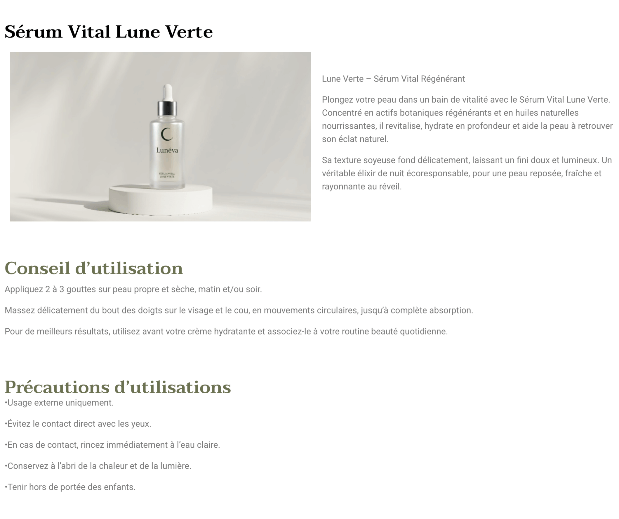 Voici un exemple de fiche produit avec le détail des ingrédients, des conseils d’utilisation et des précautions d’utilisation. Ainsi les clients sont sur d’utiliser les produits comme il faut !